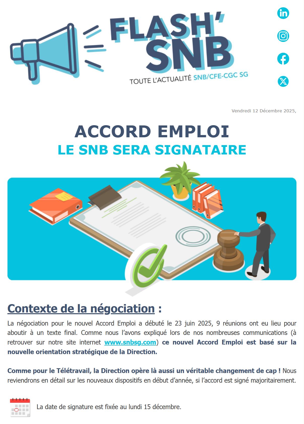 ACCORD EMPLOI : Le SNB sera signataire ✍️ 12 décembre 2025|Actualité Centraux, Actualité Réseaux, Actualités, Centraux, Réseau| Partagez cette info ! FacebookXLinkedInEmail Articles similaires N.A.O : Pour le SNB les salariés méritent PLUS ! 9 décembre 2025 N.A.O : 1ère Réunion 💶 3 décembre 2025 En direct du CSEC Novembre 2025 : Comptes-Rendus des Commissions 28 novembre 2025 ACCORD EMPLOI : Où en sommes-nous ? 25 novembre 2025