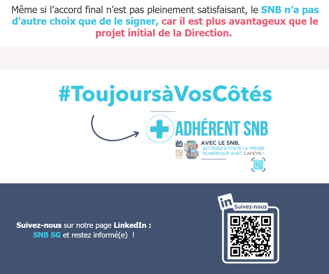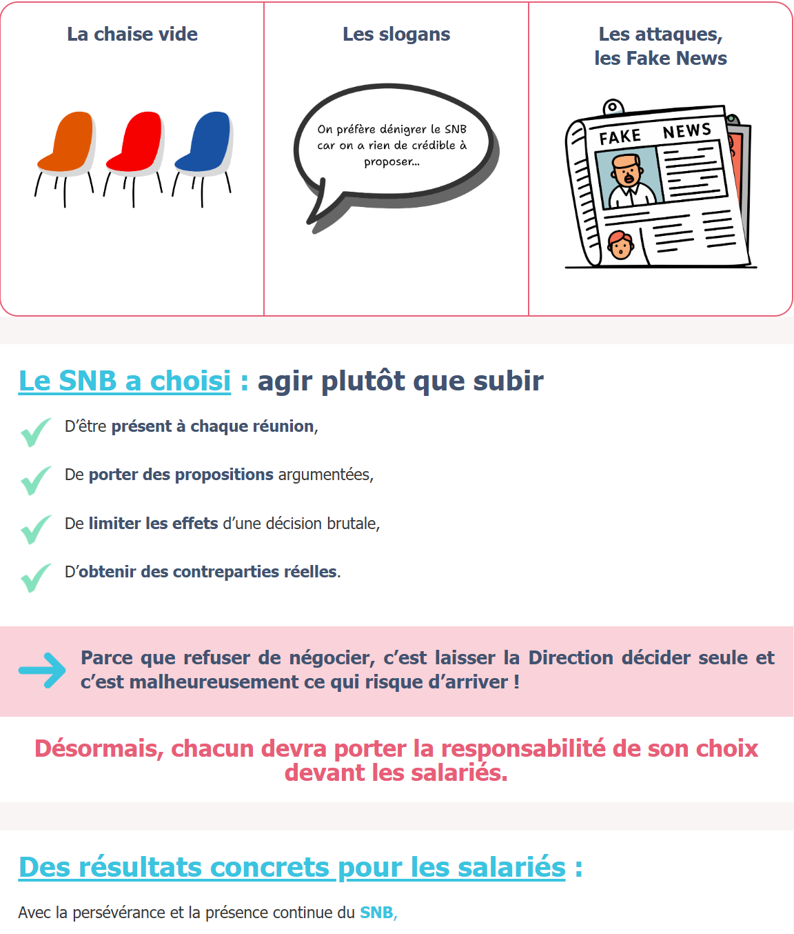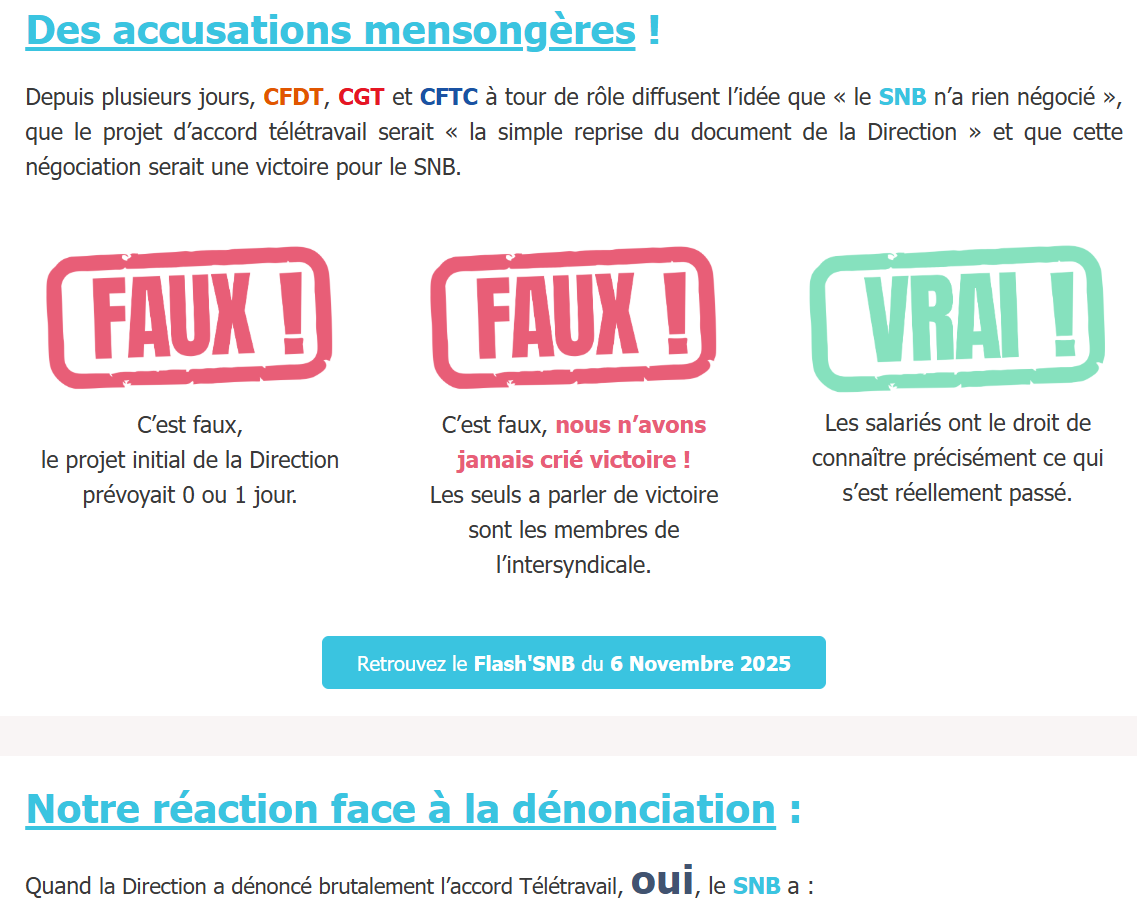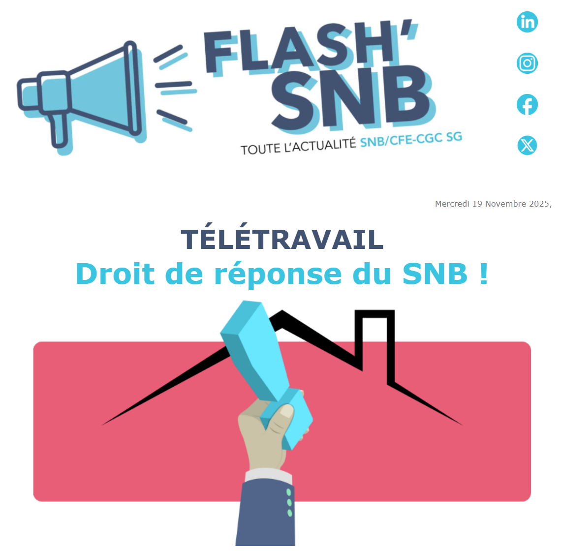 Télétravail : Droit de réponse du SNB ! 19 novembre 2025|Actualité Centraux, Actualité Réseaux, Actualités, Centraux, Réseau| Partagez cette info ! FacebookXLinkedInEmail Articles similaires Du nouveau pour l’accord Handicap ♿ 7 novembre 2025 Télétravail : Défendre ce qui peut l’être ‼️ 6 novembre 2025 SÉANCE PLÉNIÈRE : LE SNB PORTE VOS SUJETS ! 29 octobre 2025 Concertation SGRF : L’heure du bilan 🔍 16 octobre 2025